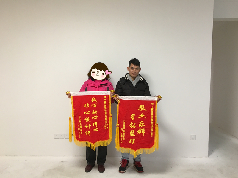 2018年12月11日,廣西工業職業技術學院曾老師送來錦旗兩幅,贊揚星藝裝飾項目監理梁敬樂,設計師陳略、朱曉麗,錦旗內容誠心 耐心 用心 貼心設計師,敬業樂群,星鉆監理。