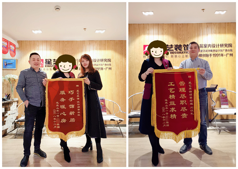 2019年1月11日,星藝裝飾業主李先生愛人送來一面錦旗,對星藝裝飾項目經理劉漢禮和設計師黃林妮細致周到的服務表示感謝,經過數月的有序施工,有星藝裝飾南寧公司設計并施工的遠辰山水一號小區李先生家正式竣工,在項目經理和工程質檢部等部分的相關驗收后,星藝裝飾南寧公司將裝修一新的房子正式交付給業主,業主滿意,送來錦旗兩幅,分別贊揚設計師服務暖心房,巧手飾新居,項目經理工藝精益求精 管理盡職盡責,點擊查看遠辰山水一號美式完工完工實景