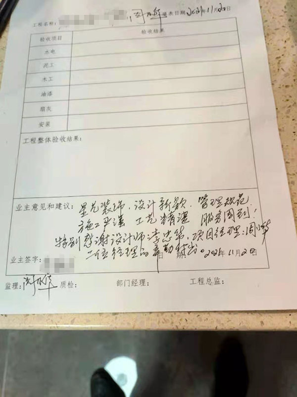 2021年11月20日,碧水天和業主李先生送來錦旗一幅,感謝星藝裝飾項目經理周小平,錦旗內容:工藝精湛 周到服務,并在工程項目驗收表上手寫寄語表示感謝