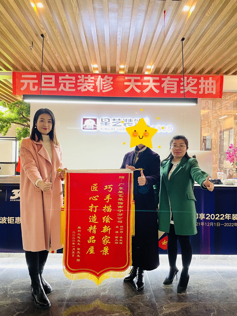 2022年元旦過后沒多久,榮和大地的業主謝先生送來錦旗一幅,錦旗內容匠心打造精品屋,巧手描繪新家景,設計師李欣倩和業主合影留念