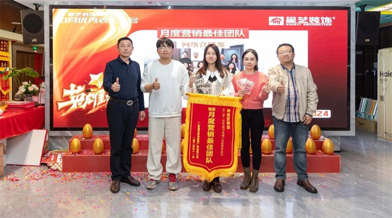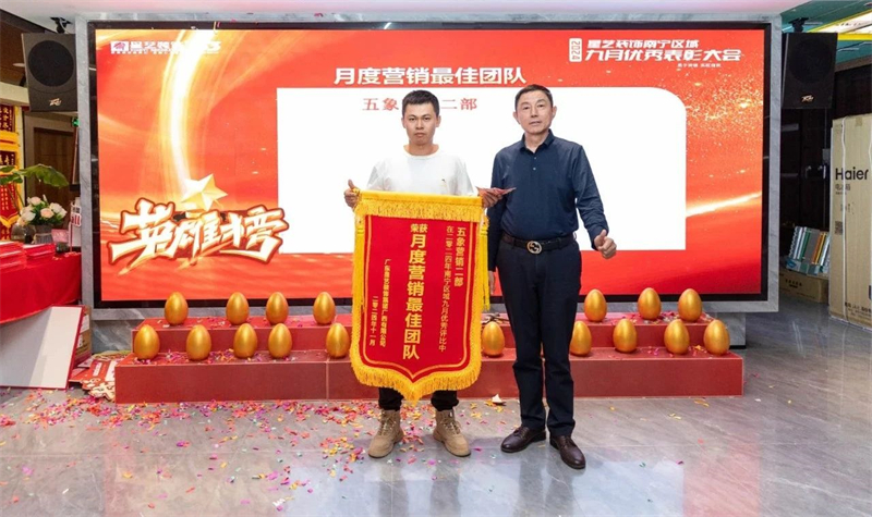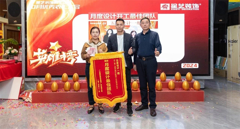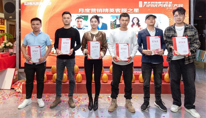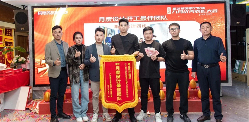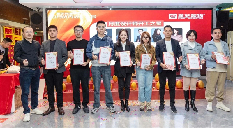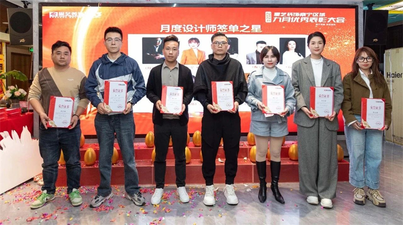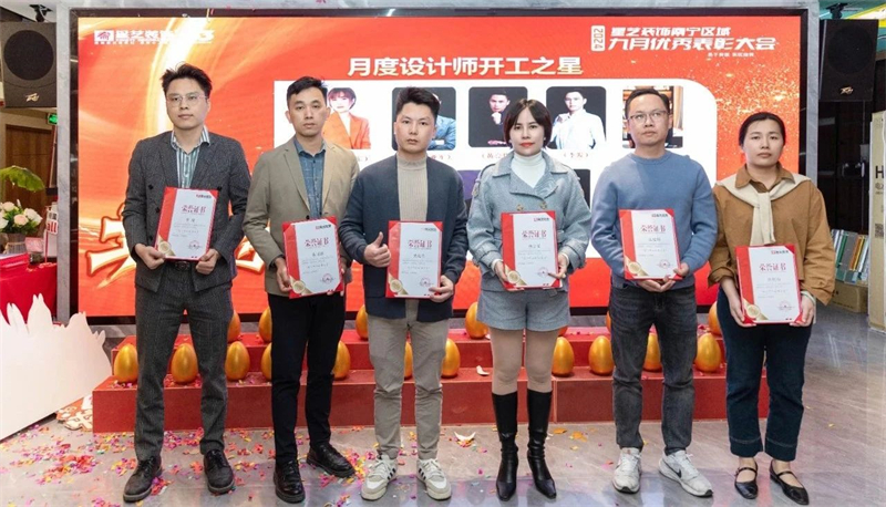 會議開始,星藝南寧區域總經理周平生、星藝南寧區域設計總監李明以及星藝南寧區域副總經理胡四民率先為9月份、10月份表現優異的星藝團隊及家人頒發月度獎勵以及證書,并號召現場星藝家人向優秀看齊。