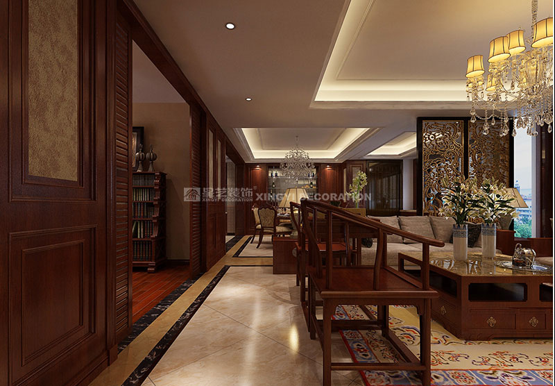 地面采用石材拼花,用石材天然的紋理和自然的色彩來修飾人工的痕跡。使客廳和餐廳的那種奢華、檔次和品位毫無保留地流淌。 在家具配置上,多選用板木結(jié)合的實(shí)木家具,家具漆面具有封閉漆效果,不僅能將木皮的紋理盡情展示,在徒手觸摸時(shí),還能感受到油漆飾面后的光滑、平整。