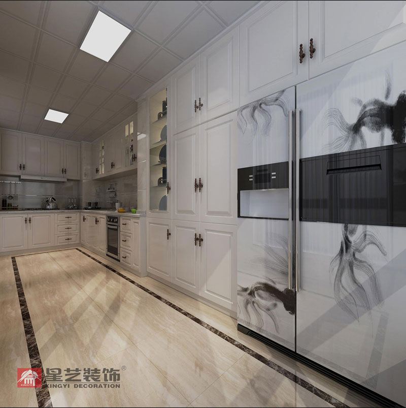 鳳景灣140平裝修案例設(shè)計(jì)說明:喜歡做美食就必須要有個(gè)大廚房,所以我就把生活陽臺(tái)納入廚房,這樣廚房空間就大很多,這樣才能滿足施展廚藝的大空間。