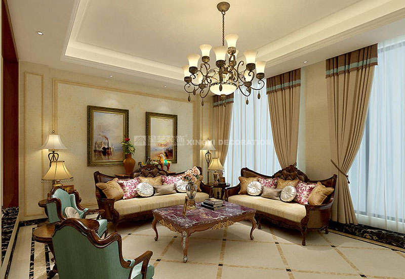 客廳:客廳作為待客區(qū)域,一般要求簡潔明快,同時(shí)裝修較其它空間要更明快光鮮,使用大量的石材和仿古藝術(shù)品,這不僅反映在軟裝擺件上對(duì)仿古藝術(shù)品的喜愛,同時(shí)也反映在裝修上對(duì)各種石材的偏愛和對(duì)各種仿舊工藝的追求。總體而言,美式風(fēng)格的客廳是寬敞而富有歷史氣息的。