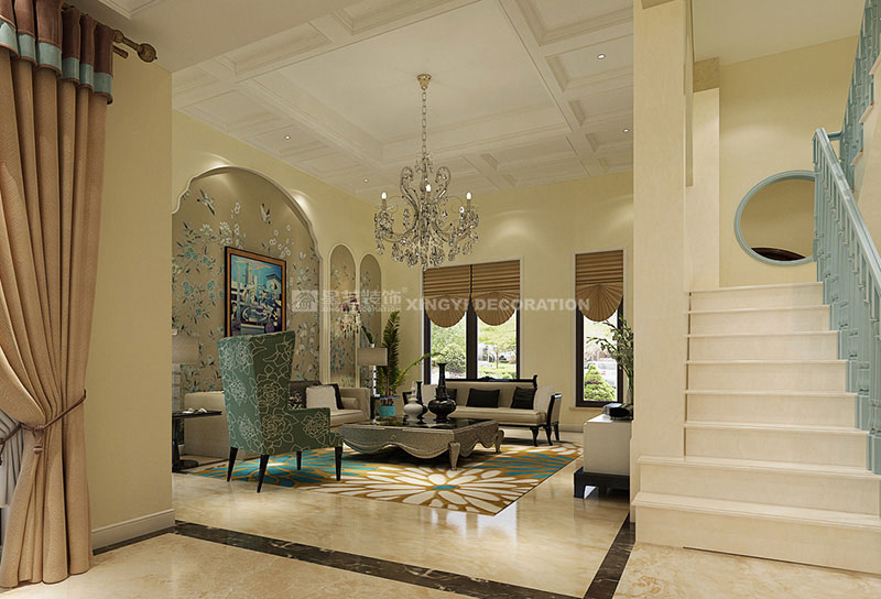 本案是具有現代色彩時尚空間,通過設計來表達對生活的關愛,緩解人們的精神壓力,帶來視覺的享受,制造內心的溫暖。在同類別墅產品中,我們設計時希望能帶給客戶不一樣的視覺感受,一陣清新自然的生活趣味彌漫在空間的每一個細節中。不喧鬧,不夸張,以親切和充滿活力的面貌打動人心。想去度假嗎?顏色的組合,可以讓每天的心情都變成絢麗。