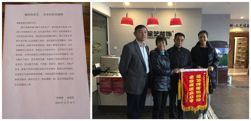 原文內(nèi)容大概如下:業(yè)主的房子是2013年交給星藝裝修的。入住新居后,一直享受星藝專業(yè)的五星售后服務(wù),發(fā)現(xiàn)房漏問(wèn)題后,我公司項(xiàng)目經(jīng)理吳建剛堅(jiān)持星藝有問(wèn)題不回避、不推諉、敢面對(duì),敢擔(dān)當(dāng)?shù)脑瓌t,急客戶所急,幫客戶所需的誠(chéng)信態(tài)度及負(fù)責(zé)精神,業(yè)主深受感動(dòng),故送錦旗給予嘉獎(jiǎng)。附上原文: