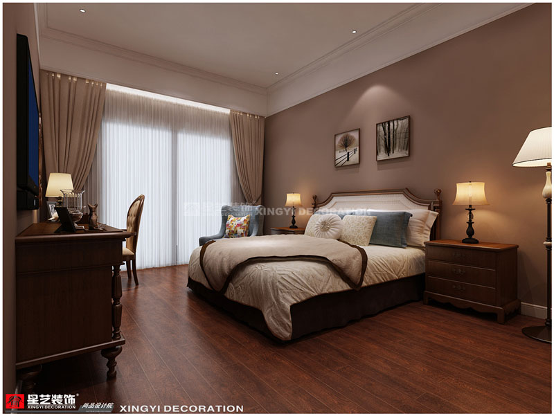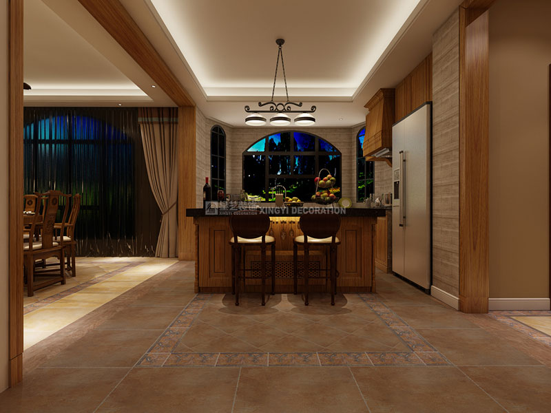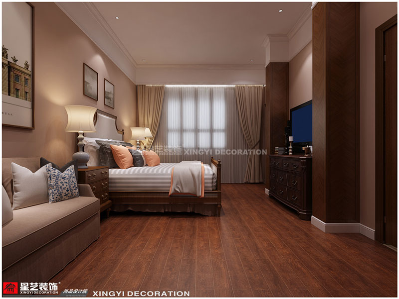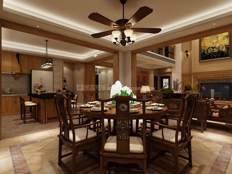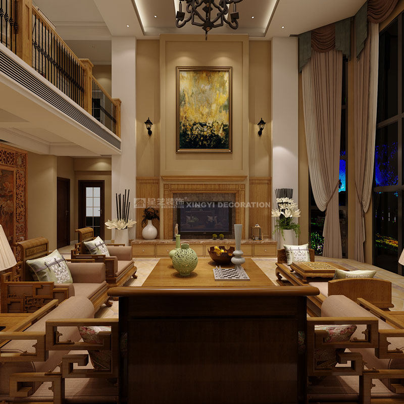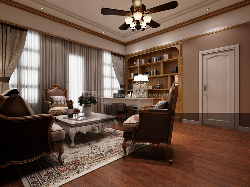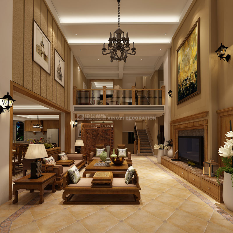 業主經常出國,愛人小孩都在國外,并且喜歡打高爾夫球。在整體設計上,給定位了自由休閑的美式風格,在客廳的設計上結合了中式的韻味,舒適大方。