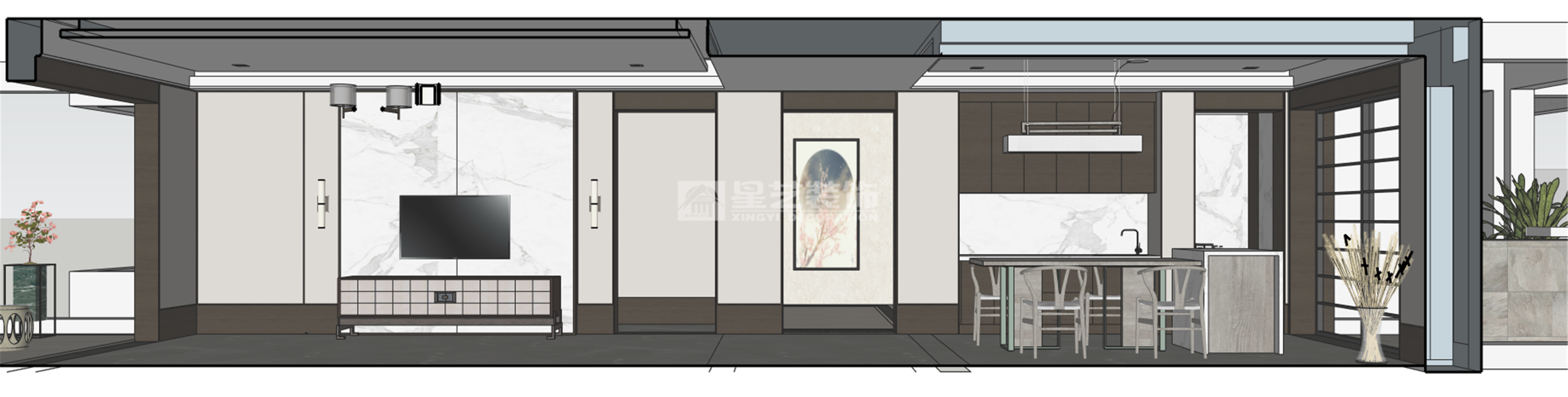 新中式風(fēng)格是繼承一種既繼承了中國古典園林的基本原素又融入現(xiàn)代簡約的幾何圖案及線條的設(shè)計(jì)風(fēng)格。在室內(nèi)色彩方面,本方案以藍(lán)色,金黃色,玉脂白,水墨黑和原木色來打造新中式的氣氛。除了保留中式韻味外,還加了大理石、玻璃、燈帶、白色線條等現(xiàn)代造型,簡潔的線條勾畫出空間的層次感,家具顏色以深棕色為主色調(diào),給人一種深厚沉穩(wěn)的感,極大滿足了現(xiàn)代人追求的時(shí)尚感和實(shí)用的原則。